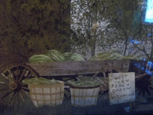 This is a print under glass by Billy Jacobs entitled PRODUCE WAGON. Measures 22" x 14", including 1 1/4" black flat wooden frame.Depicts a nice old barn with trees and an old wagon with watermelons and sweet corn for sale! Made in USA!
